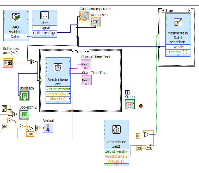 Der DAQ-Assistent erfasst MW eines K-Typ Thermoelementes und gibt diese in ein Filte, der das Signal glättet (100 Halbwertsbreite gleitender Durschnitt). Nun möchte ich, dass aus diesem Datenfluss alle 30 Sekunden ein Messert in eine Excel Datei geschrieben wird.