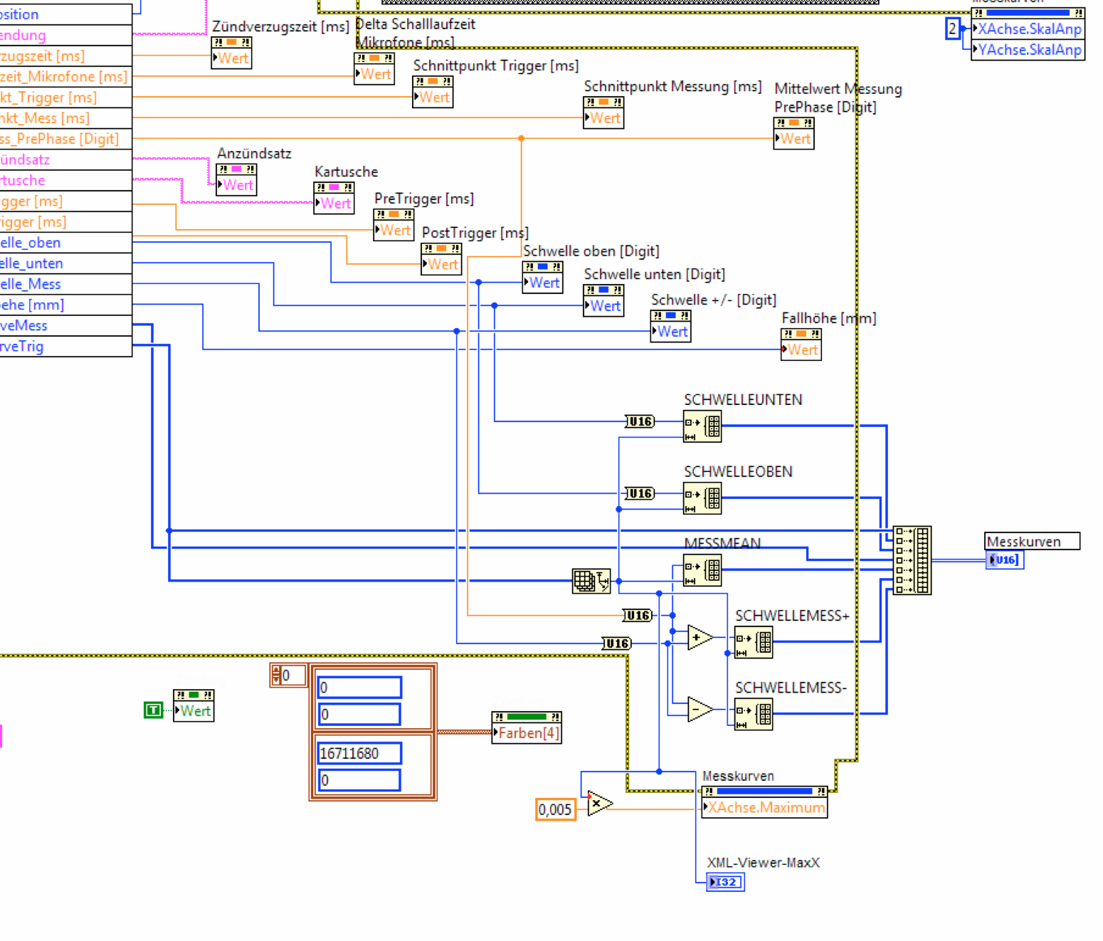 Die vielen Propertynodes (oder gegebenenfalls auch Lokalen Variablen) kannst du dir ganz einfach sparen: Einfach alle Anzeigeelemente in einen Cluster setzen, diesen strikt typisieren und überall verwenden. Natürlich auch in dem Cluster, der jetzt schon (da links im Bild) besteht. Gigantischer Vorteil: ein einziger Draht! Weiterer Vorteil: Der Sourcecode wird extrem übersichtlich - sodass das Wolfsuchen extrem minimiert werden kann.