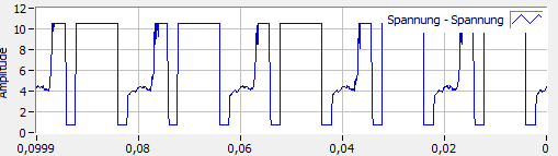 Ich habe dies versucht und es funktioniert tatsächlich. Wenn ich jedoch dazwischen einen Widerstand schalte, funktioniert es nicht. Das Sognal sieht dann zwar ein bisschen besser aus, aber es klappt trotzdem nicht. Eine direkte Verbindung von AI0- und AIGND funktioniert. Was mich jedoch wundert ist, dass bei der Verbindung von AI0- und AIGND ein anderer Sensor, der auch differentiell über AI1 und AI1- gemessen wird, sich auch verbessert (Vorher war das Signal dieses Sensors so ähnlich wie oben im Bild). Dabei handelt es sich um einen MID. Dieser ist jedoch mittels Schuko-Stecker geerdet. Das bedeutet, dass die Verbindung von AI0- und AIGND Einfluss auf meinen anderen Sensor hat. Weiß vielleicht jemand woran dies liegen könnte?