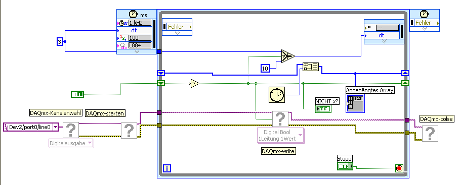 Auch DAQmx Elemente für die Ausgabe der Boolschen Werte sind darin enthalten, jedoch kann ich sie auf meinem 2. Rechner nicht im Blockdiagramm laden, aber ich denke man kann erkennen, wie ich das gemacht habe.
