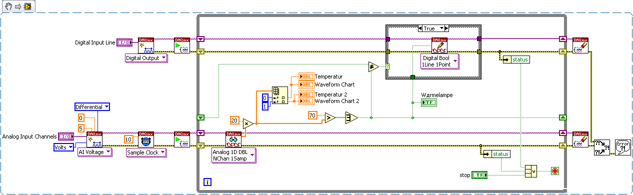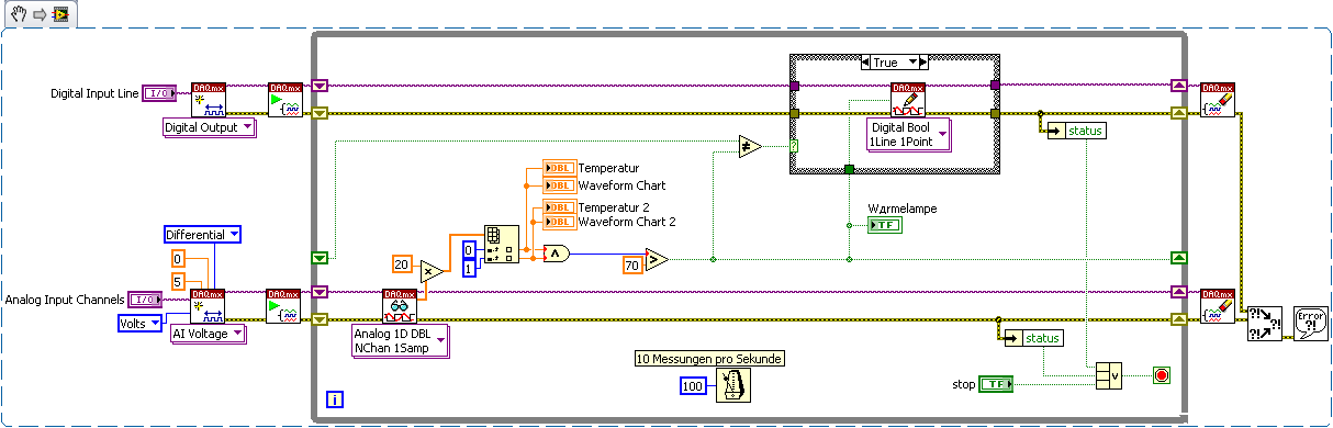 ich war ja schon länger nicht mehr hier (Klausuren Huh). Jedenfalls bin ich mal wieder dazu gekommen, an meinen Projektchen zu arbeiten und tatsächlich läuft auch alles. ABER: Ich hab das Gefühl, dass ich schummel: Zu meiner Temperaturmessung, wird eine Wärmelamp an- bzw. ausgeschaltet, habe das durch einen Case verwirklicht. Dass die Wärmelampe an ist, soll auch auf dem Frontpanel durch LED zu sehen sein. Da ich aber keine Möglichkeit gefunden habe, den Boolean direkt mit dem Digital Output zu verbinden, habe ich einfach mit True bzw. False- Constanten gearbeitet...also, gibt es einen Weg, den Digital Output mit meiner LED zu verbinden???