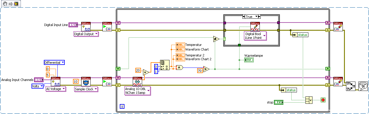 ich war ja schon länger nicht mehr hier (Klausuren Huh). Jedenfalls bin ich mal wieder dazu gekommen, an meinen Projektchen zu arbeiten und tatsächlich läuft auch alles. ABER: Ich hab das Gefühl, dass ich schummel: Zu meiner Temperaturmessung, wird eine Wärmelamp an- bzw. ausgeschaltet, habe das durch einen Case verwirklicht. Dass die Wärmelampe an ist, soll auch auf dem Frontpanel durch LED zu sehen sein. Da ich aber keine Möglichkeit gefunden habe, den Boolean direkt mit dem Digital Output zu verbinden, habe ich einfach mit True bzw. False- Constanten gearbeitet...also, gibt es einen Weg, den Digital Output mit meiner LED zu verbinden???