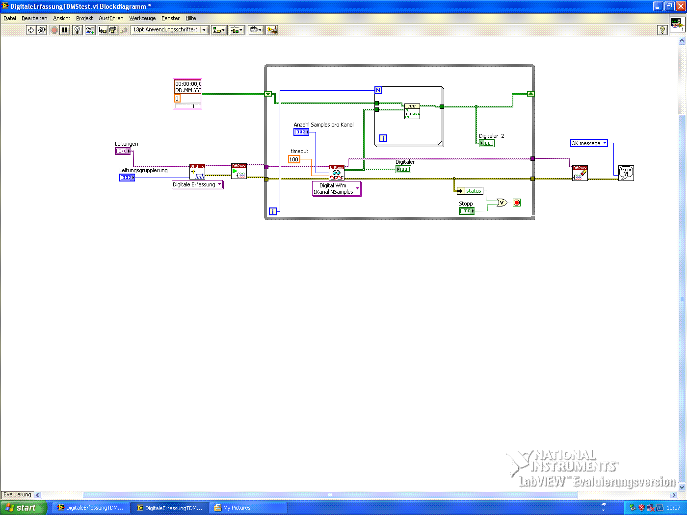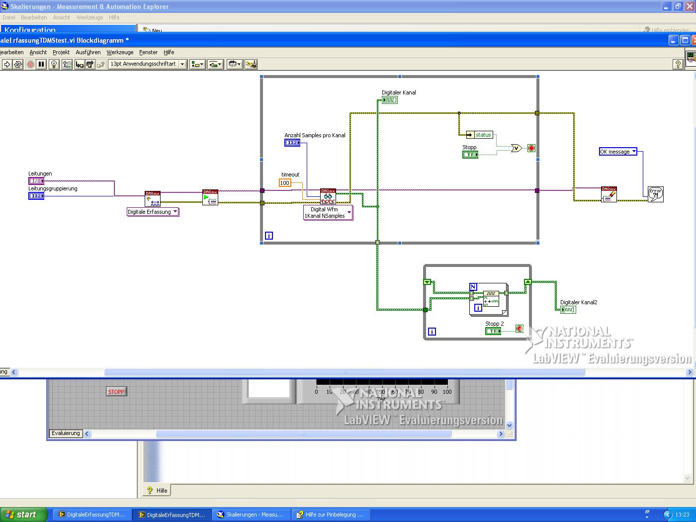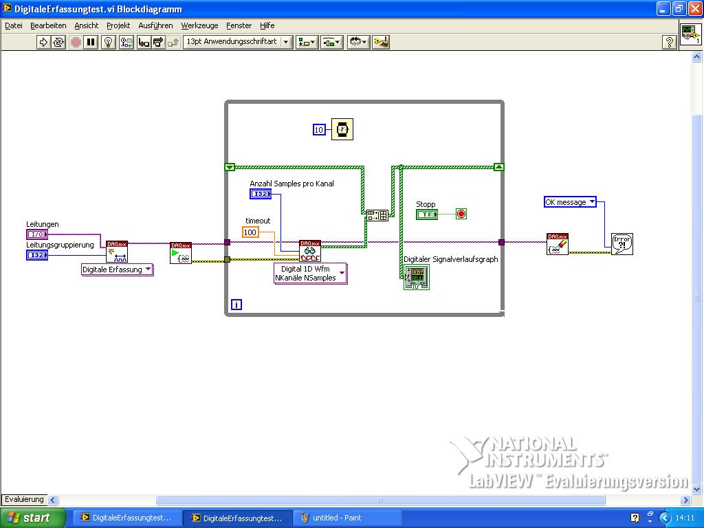 Ich habe jetzt um Waveformgraphen aneinander zu hängen folgende Schaltung aufgebaut.
