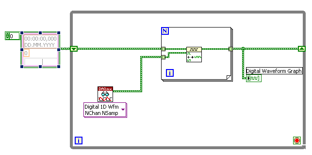 Wenn auf 1D Digital Waveform gestellt ist, dann ist der Ausgang des DAQmx-Read ein 1D-Array of "Digital Waveforms", wobei jedes Array-Element ein erfasster Kanal ist. Ein Waveform ist ein spezieller Datentyp in LabVIEW. Im Prinzip ist es ein Cluster, der aus folgenden Elementen besteht: "Startzeit t0", "Delta T", und ein 1D-Array an Daten. Es können dann noch weitere Attribute enthalten sein, aber das ist hier nicht wichtig. Wenn du das jetzt mit Build Array zusammenfügst, dann hängst du nicht die Waveforms zusammen, sondern verlängerst das 1D-Array immer mehr, erzeugst also in der Darstellung immer mehr Kanäle.