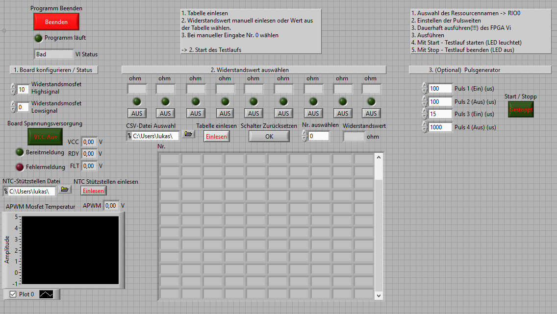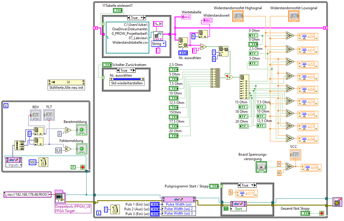 Kommen wir auch zu meiner weiteren Frage, wieso kann ich die Stopp Bedingungen bei mehreren Schleifen nicht per Verbindung zwischen zwei Schleifen tunneln? Das funktioniert irgendwie nicht, stattdessen musste ich eine lokale Variable hierfür anlegen, damit ich mit den Button "Programm beende" alle relevanten Schleifen beenden kann und das VI stopp. Hast du hierzu noch andere möglichkeiten das Programm zu beenden, vieleicht ein bisschen edler :-D ?