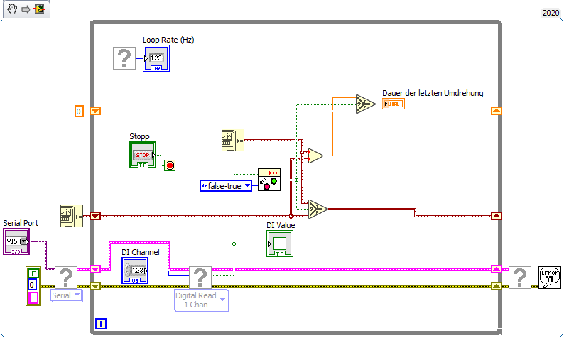 Ich verwende LabView 2019 und eine Arduino Uno über das Linx Tool. Auf der Arduino habe ich den Hallsensor über den Digitalpin angeschlossen. Nun war meine Idee zur Drehzahlmessung, dass ich über den Block "verstrichene Zeit" die Zeit stoppe und jedes Mal, wenn der Sensor True schaltet, also eine Umdrehung rum ist, die Zeit gestoppt, gespeichert und in die Drehzahl umgerechnet im GUI angezeigt wird. Anschließend wird die Zeit neu gestartet. Beim der nächsten Umdrehung wird wieder die neue Zeit gestoppt, der alte gespeicherte Wert überschrieben und wieder im GUI als Drehzahl ausgegeben.