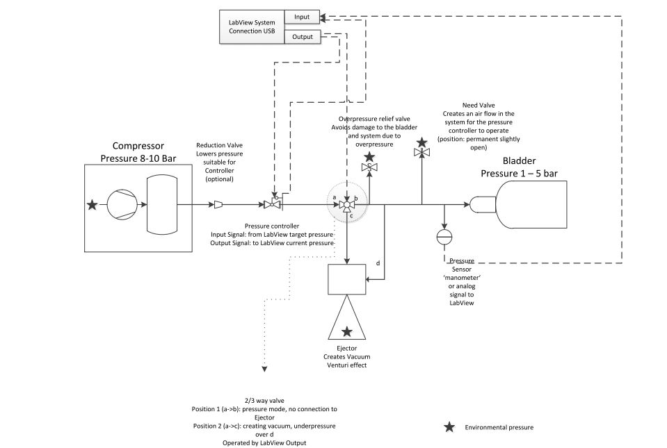 ' schrieb:Ziel ist es in LabView auf "Start" zu drücken und es regelt sich ein Druck von 0.5Bar ein, dieser Druck wird für eine Kalibrierung benötigt. Nach einem drücken auf "Weiter" regelt sich ein Druck von 1Bar ein usw. bis 5 Bar. Anschliessend soll noch die Möglichkeit gegeben sein mithilfe eines Ejektors (Venturiprinzip) von 5bar auf (Leicht-)Vakuum umzustellen, auch durch Input im LabView interface.