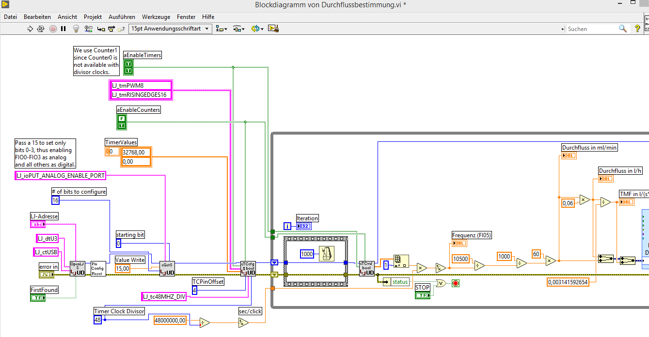 Ich verwende einen BioTech-FCH-m-PP Flow-Sensor mit einem Labjack U3-HV Datenerfassungsmodul. Innerhalb der Example-Listen von LabJack bin ich auf ein Frequenzauslese-VI gestoßen, welches nach simplen Veränderungen meinen Vorstellungen entsprach.