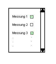 ich brauche eine dynamisch generierte Checkbox wie auf meiner Zeichnung zu sehen. Dabei soll die Anzahl an Zeilen und der Bezeichner (Messung X) dynamisch mit der Laufzeit generiert werden, da die Anzahl an Messungen dynamisch ist. Ich hab schon versucht mit Array und Clustern, aber ich kann die einzelnen Captions _in_ einem generierten Cluster nicht ändern bzw. die Captions werden in einem Cluster nicht übernommen.