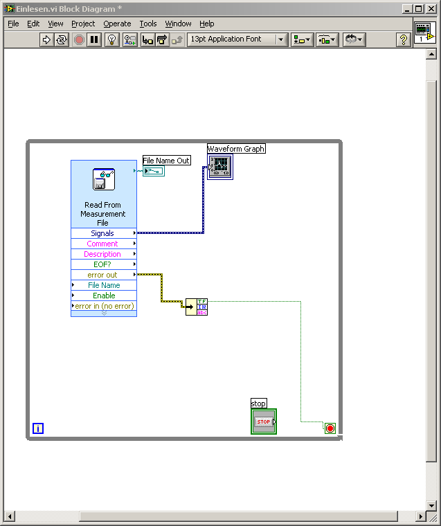 Bitte seid mit uns Nachsichtig. Wir haben noch keine error out verknüpfung erstellt. Das VI zum einlesen besteht bis jetzt aus einem Read LabVIEW Measurement file vi und einem scope. wollen das ja nur zum laufen bringen und danach damit weiterarbeiten.