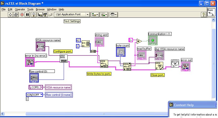 Für meine DA möchte ich einen Controller ansprechen. Um die Kommunikation zu testen, kann ich die Taste "ESC" drücken und es sollte ein > Zeichen zurückkomen. Mit dem Hyperterminal funktioniert es, doch mit lv bring ich es nicht zum laufen und wie muss ich das realisieren, damit ich die Taste nicht drücken muss, sondern beim Start dieser Test automatisch ausgeführt wird?