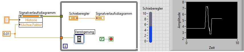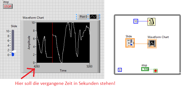 Wenn ich stattdessen dt frei lasse und bei t0 die aktuelle Systemzeit (also Symbol innerhalb der while-Schleife) eintrage kommt zwar ein Graph zustande, allerdings steht dann als Beschriftung der Zeitachse wieder etwas von 9728392:xx:xx oder so ähnlich da. Kann man hier nicht einfach die verstrichenen Sekunden anzeigen?