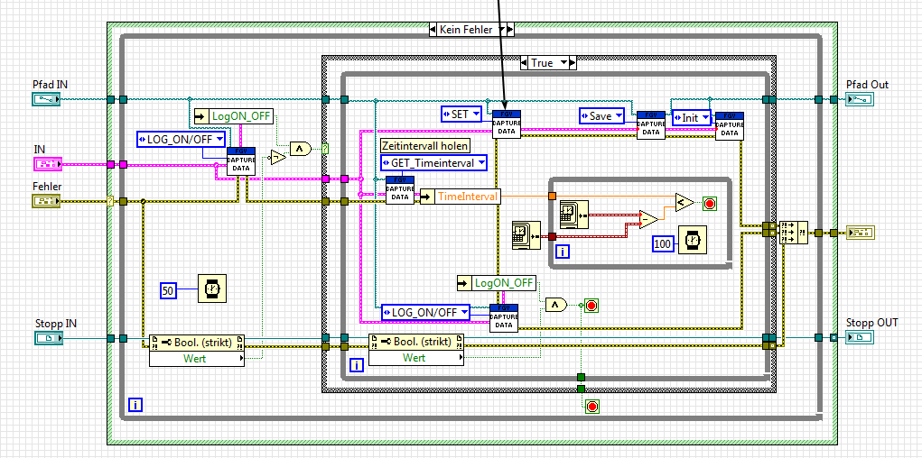 Wie übergebe ich meine Messwerte dieser Vi? Es ist ja so, das ich die Werte in FGV in mehreren Schritten aufnehme. Diese sollen ja als Verbund in Datei gespeichert werden und das alle 60s. Wär ja alles kein Problem wenn ich nur die Daten übergeben könnte und das an einer definierten Stelle im MainVi. Habe versucht die Vi im Hintergrund laufen zu lassen und am Ende der Stapelsequenz(die Stelle an der die Messwerte vollständig ermittelt wurden), die Daten in die Vi zu übergeben. Hab die Vi in Stapelsequenz eingebaut. Labview findet das aber nicht so toll und spuckt mir den Fehler 1000 aus.