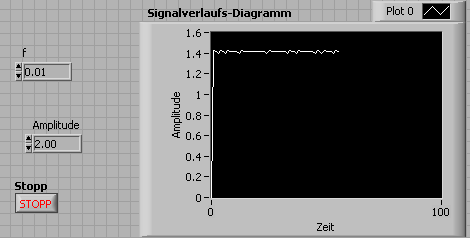 Das Progrämmchen ist allerdings mehr als einfach. Als Zeit wird hier einfach der Schleifenzähler benutzt, dh. es ist immer dt=1sec. Da man aber pro Halbwelle für eine einigermaßen genaue Messung wenigstens 10 Punkte haben sollte, sollte der Eingabewert für die Frequenz kleiner als 0.05Hz sein - also nicht gerade praxisnah. Ich nehme an, daß Du einfach zu hohe Frequenzwerte eingegeben hast.