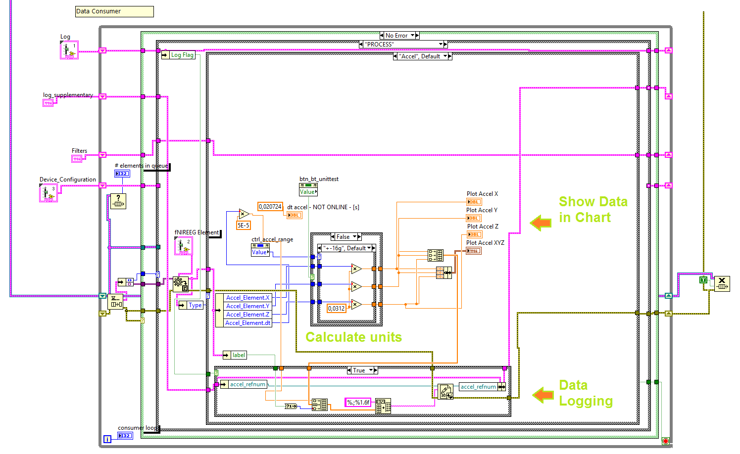 Ebendieses gilt natürlich auch für die Anzeige im Graph. QSM (als FGV mit private-variablen) machen, Daten und Steuerwerte per Queue senden: Wenn der Anwender (oder wer auch immer) ctrl_accel_range ändert, wird genau in dem Moment, in dem geändert wird, einmalig der Steuerwert ctrl_accel_range in die QSM geschickt - und dort als ganz normale private Variable (z.B. in einem Schieberegister) verwaltet ...