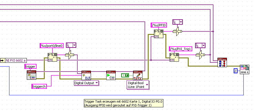 Also, ich erzeuge einen Takt mit Ctr 6251/1, den route ich auf PXI_Trig0 (siehe im linken Screenshot oben links).