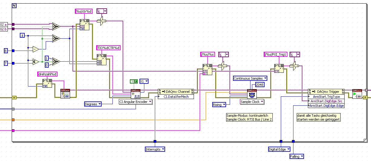 ich denke dass man hier auch einen x-beliebigen anderen (externen) Digitalen Puls verwenden kann, wichtig ist nur, dass er rechtzeitig kommt. Wenn man ein bisschen basteln möchte, und einer der Encoder ein Z-Signal hat könnte man auch das elektrisch auf einen DI legen, entsprechend routen und den verwenden. Der Trigger wird wie gesagt nur benötigt, damit die Tasks gleichzeitg loslaufen. Da sie ein und denselben Messtakt verwenden ist somit sichergestellt, dass sie absolut synchron laufen ...