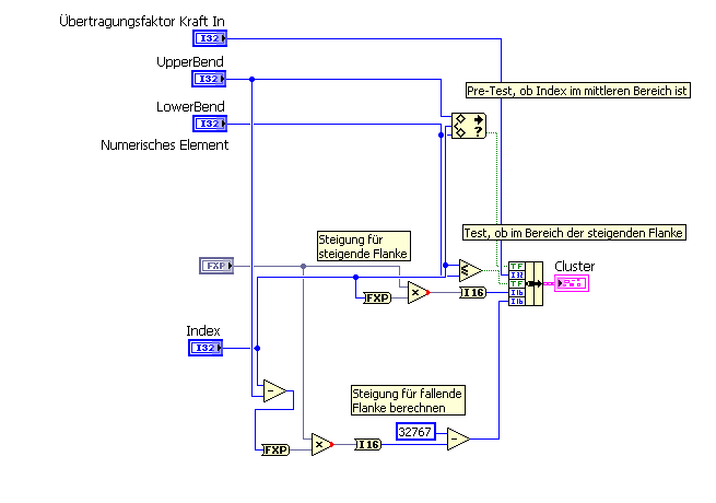 Die Steigung ist für jeden Index gleich, wenn die Indexwerte n_low und n_high sowie die gesamt-Sample-Anzahl bekannt ist. Daher wird das ganze in einem Sub-VI (FPGA-Sub-FaderValue.vi) vor meiner eigentlichen Ausgabe berechnet. Zahlenformat ist FXP, weil mir sonst Auflösung verloren geht (genauer gesagt, wenn n_low > A)