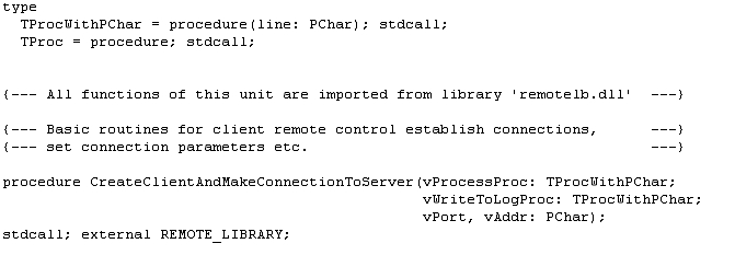 Das was da steht und das, was in der zweiten Graphik steht "type TProcWithPChar = procedure(line: PChar); stdcall;" passt aber nicht zusammen. Und da halt ich mich doch zuerst einmal an die Graphik. PChars, also der Parameter line in der Funktion sowie die beiden anderen Parameter, sind Pointer auf Strings.