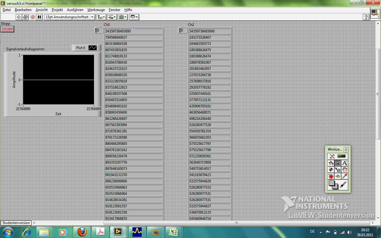 900 000 000 000. Also wie es für mich aussieht auch irgendwie Sinusförmig, aber wenn man es an ein Signalverlaufdiagramm anschließt, kommt nur eine Nulllinie und die Zeitachse ändert sich. Ich schätze mal, dass das schon die richtigen Zahlen sind, aber in irgendeinem komischen Format. Weil eigentlich werte von 159 bis 200 rauskommen müssten.