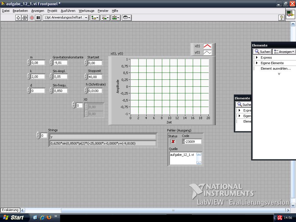 Hallo ich habe ein Problem bei dieser Aufgabe aus dem Buch "Einführung in LabVIEW" Kapitel 12 DGL_ODE2.vi ich kriege immer die Fehlermeldung Code:-23009 ich habe nachgesehen und es heißt ich habe möglicherweise falsche Eingaben gemacht. Aber ich habe genau das gleiche wie im Buch eingegeben und trotzdem taucht auf dem graphen nichts auf und der fehlercode erscheint. Ich habe das vi angehängt vllt kommt einer von euch darauf was nicht stimmt!!!