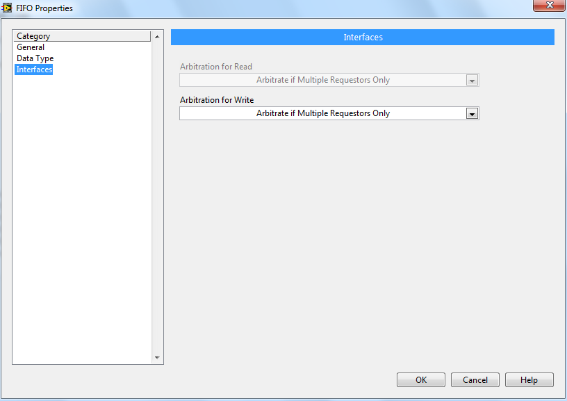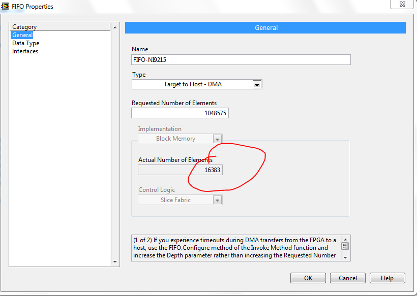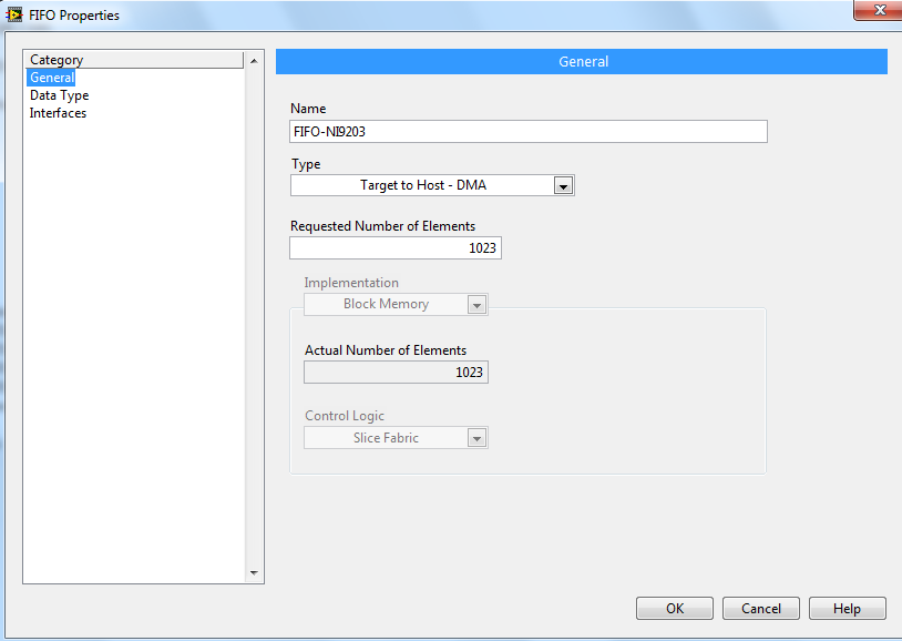 DMA-FIFOS die zwischen FPGA und RT Daten austauschen bestehen aus 2 Teilen. Dem FPGA Teil, konfigurierbar unter dem FPGA-Target, und dem RT Teil, konfigurierbar über den Eigenschaftsknoten Configure.