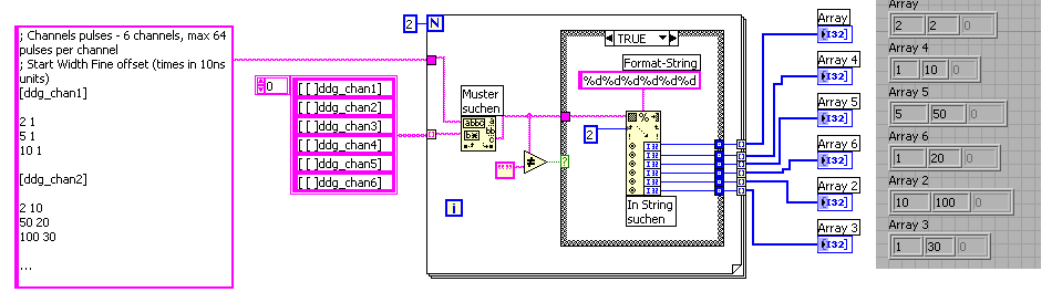 Ich habe mal wieder ein Problem an dem ich festhänge und hoffe, dass jemand mi da vielleicht weiterhelfen kann. Und zwar geht es um das auslesen einer Textdatei, in der die Einstellungen eines Delay-Generators mit 6 digitalen Ausgängen gespeichert sind.