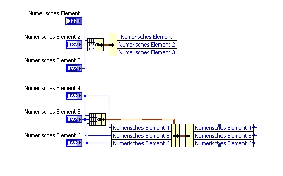 Auch eine schöne Idee. Zwar etwas ressourcenfressender, würde mcih aber nciht erheblich stören. Schade nur, dass meine Elemente nicht als beschriftete Bedienelemente vorliegen. In meinem konkreten Fall ist es so, dass ich ein Langes Array mit allen Messwerten (unsortiert) habe. In einem SubVI werden die Messwerte sortiert und in Teilarrays untergliedert. Diese Arrays bündel ich dann zu nem Cluster. Die Array-Leitungen die aus den Funktionen ArrayIndizieren und TeilArray raus kommen, kann ich leider nicht beschriften.