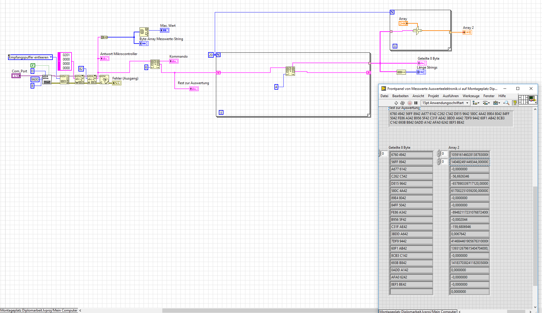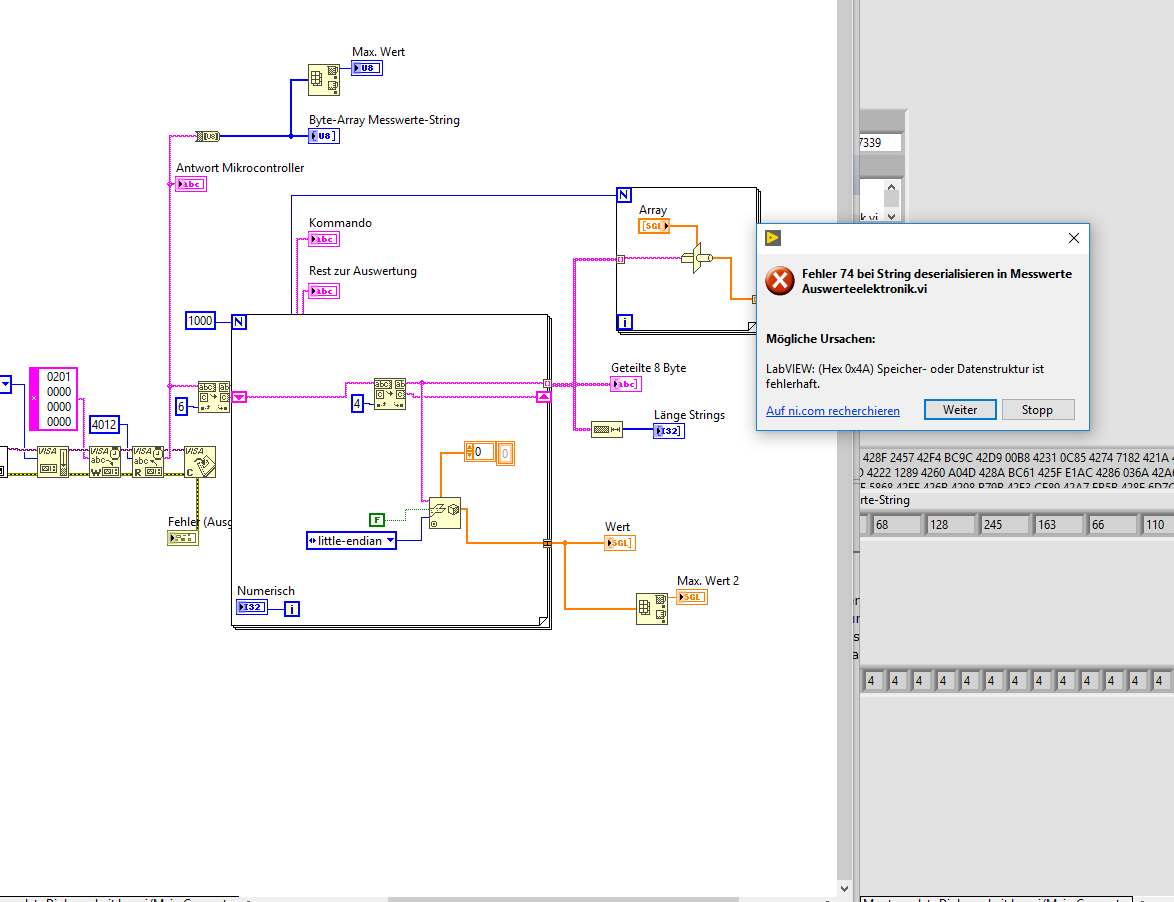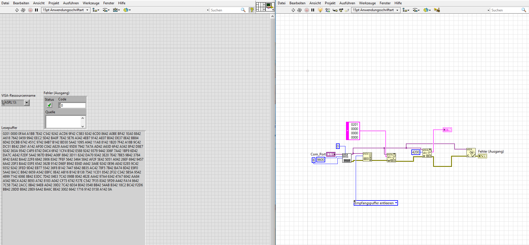 Ich soll Messwerte einlesen. Diese soll ich dann verarbeiten und eine Aktion auslösen. Genauer gesagt, ich rastere mit Lineartischen eine Probe ab, nehme Messwerte auf und LabView soll sich den besten Wert merken und dann auf die gespeicherte Position zurückfahren. Soweit so gut. Jetzt habe ich ein Dummy der Auswerteelektronik und probiere erstmal nur die Messwerte auszulesen. Die Elektronik ist Marke Eigenbau und mit einem selbstgeschrieben Programm auf einem µC versehen. Ich schaffe es den µC anzusprechen und von diesem Werte zuerhalten (eigentlich eine einfache Aufgabe, daher auch das VI recht einfach). Jetzt hat mir der Programmierer gesagt er hätte eine Testsoftware auf den µC geschrieben die auf einen Befehl mit dem senden von 1001 Floatwert reagiert. Ich sende Hex: 02 01 00 00 00 00 00 00 und kriege Hex: 02 01 00 00 0F A4 + 4004 Byte als0 1001 Floatwert + 2 Byte checksumme zurück. Das Problem ist nun, das es immer eine unterschiedliche Anzahl von Floatwerten sind, obwohl es laut Programmierer immer 1001 sein müssen. Frage ist ob ich einen Fehler mache. Jetzt überlege ich ob ich das Abfragen irgendwo zwischen drin mache, sprich der µC sendet und ich klinke mich irgendwo ein. Obwohl er ja auf ein sende Befehl reagiert. Oder der Programmierer hat was falsch gemacht. Wisst ihr evnetuell voran es liegen könnte? Habe mal ein Bild des VI angehängt, welches ich einmal ausführe.