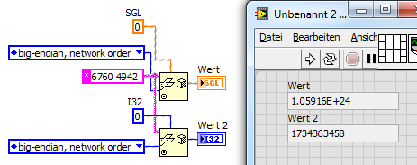 ich hab gerade noch ein kleines Problem. Inzwischen habe ich es geschafft den Hex-String in 4 Byte große Teile zu zerlegen und die ersten 6-Bytes "abzuschneiden". Nun ist es so, das die 4-Byte Großen Teile Floating Point Zahl entsprechen. An der Umwandlung von 4-Byte Hex-String zu Floating Point scheitere ich gerade. Ich hab mal das VI und einen Screenshot angehängt. Ran gegangen bin ich mit der Typecast Funktion, aber es kommen zum Beispiel negative Werte vor, was laut Programmierer nicht der Fall sein darf. Auch sollen alle Werte zwischen 50 und 100 Liegen. Auch das ist bei mir nicht der Fall. Habt ihr eventuell eine Lösung parat?