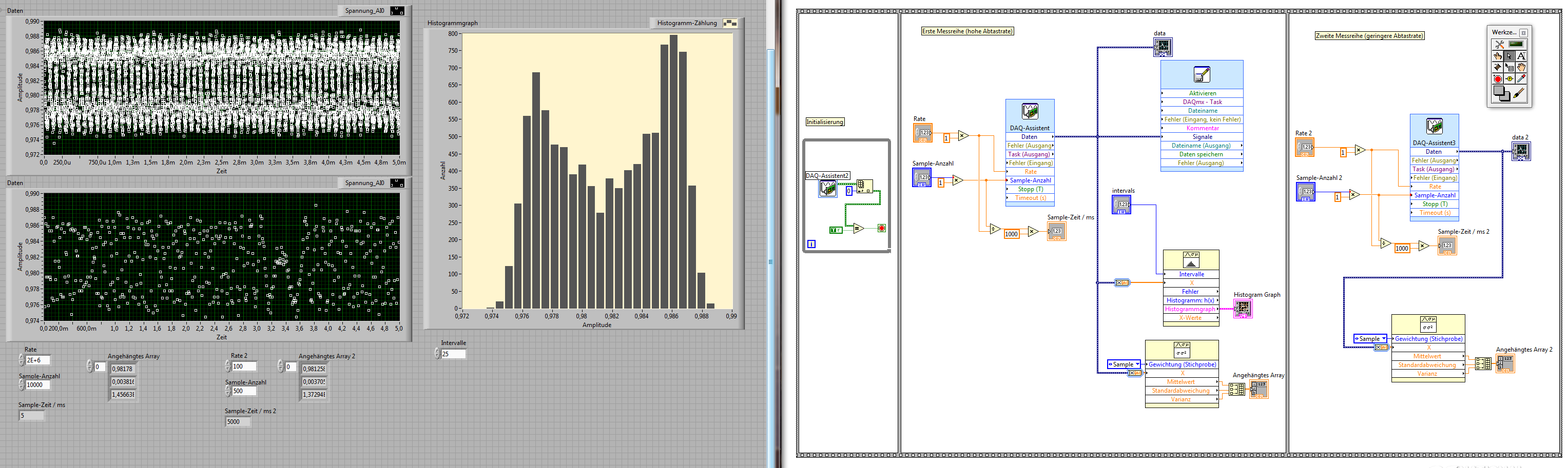 Die Datenerfassungskarte hat 8 ADCs und kann somit 8 Kanäle simultan erfassen. Nur leider habe ich noch nicht rausgefunden, wie das gehen soll.