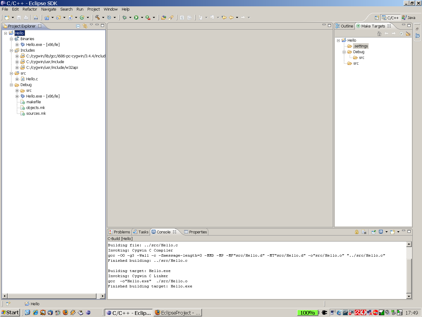Nachtrag: Wenn ich versuche die enstandene .exe im workspace über die Kommandozeile (cmd) auszuführen, erhalte ich die Fehlermeldung: Der Prozedureinsprungpunkt "impure.ptr" wurde in der DLL "Cygwin1.dll" nicht gefunden.