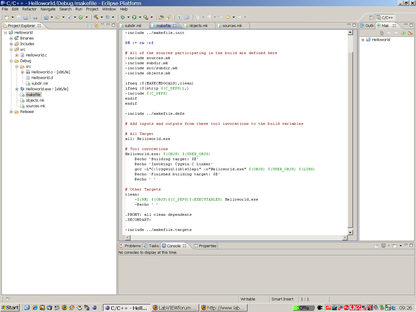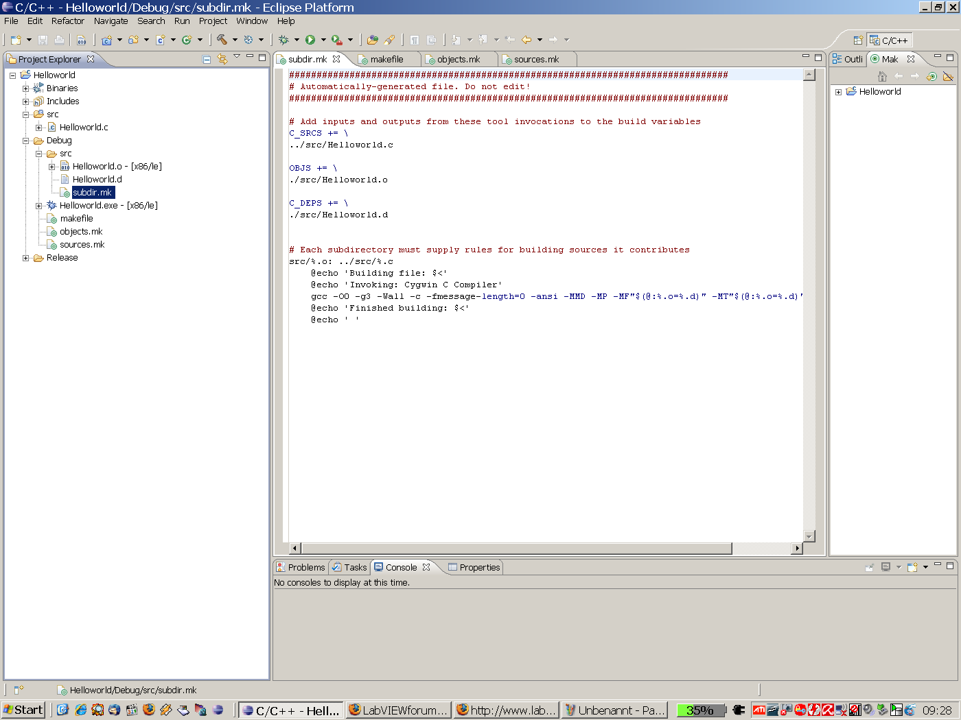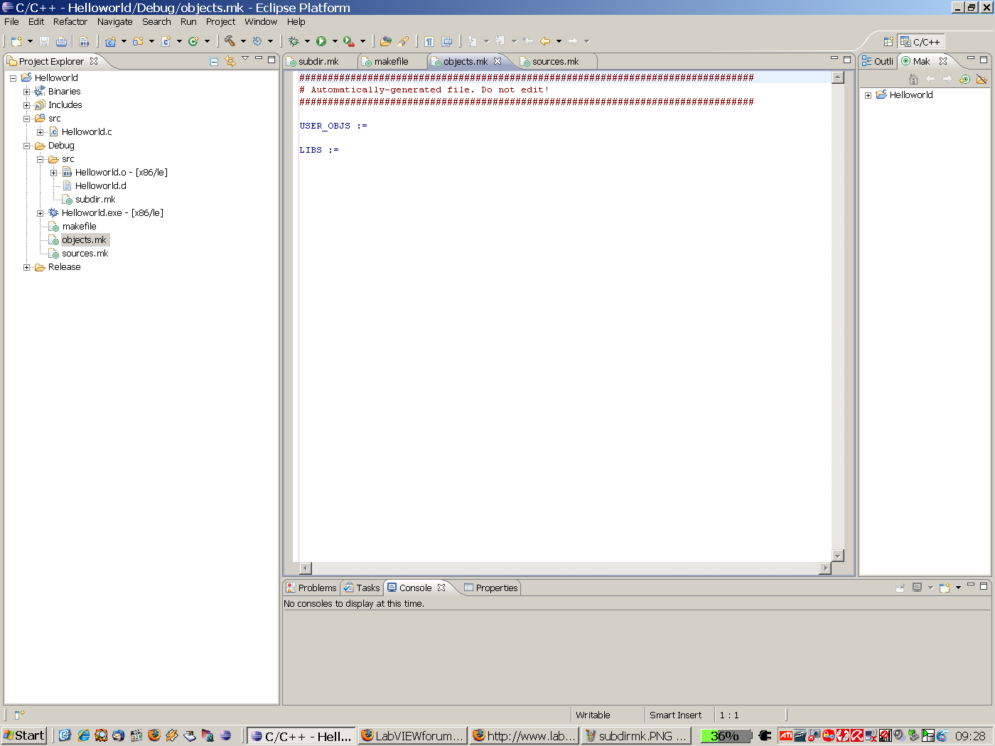 Also, so wie ich das verstehe, handelt es sich bei den files sourcesmk, objectsmk und subdirsmk nur um Variablendeklarationen/Zuweisungen, die dann in der eigentlichen makefile abgerufen werden. Dann wäre meine Frage: Ist das alles so richtig, oder muss ich entgegen der Anweisung "do not edit" hier noch was hinzufügen???