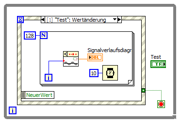 Beim Drücken von Test passiert ers mal nichts. Beim Loslassen geschieht die Wertänderung auf true, das Ereignis wird ausgelöst und bearbeitet. Damit mögliche andere Ereignisse nicht warten, sollte die Abarbeitung im Case möglichst schnell erfolgen, also unnötige Waits vermieden werden. Das Wait hier habe ich nur aus didaktischen Gründen eingefügt.