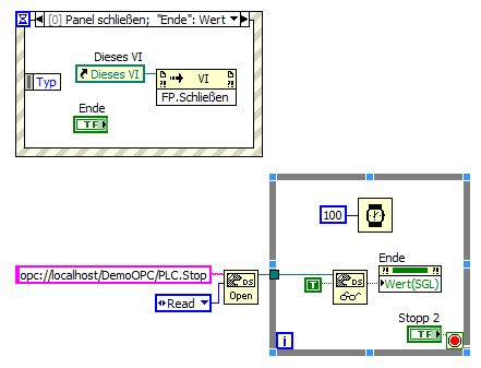 Kurzzusammenfassung: Bei einer Änderung des Wertes der Adresse opc://localhost/DemoOPC/PLC.Stop von False nach True soll ein Ereigniss ausgelöst werden welches das VI abbricht.