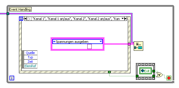 Die Programmstruktur ist eine Queued State Machine. Wird vom Nutzer einer der Kanäle geschaltet bzw. der Ausgangswert geändert, wird das Ereignis abgefangen und vom Programm entsprechend reagiert. Alle diese Ereignisse werden in einem Frame der Eventstruktur abgefangen, da immer die gleichen Programmabläufe ausgeführt werden sollen (siehe Ausschnitt Blockdiagramm).