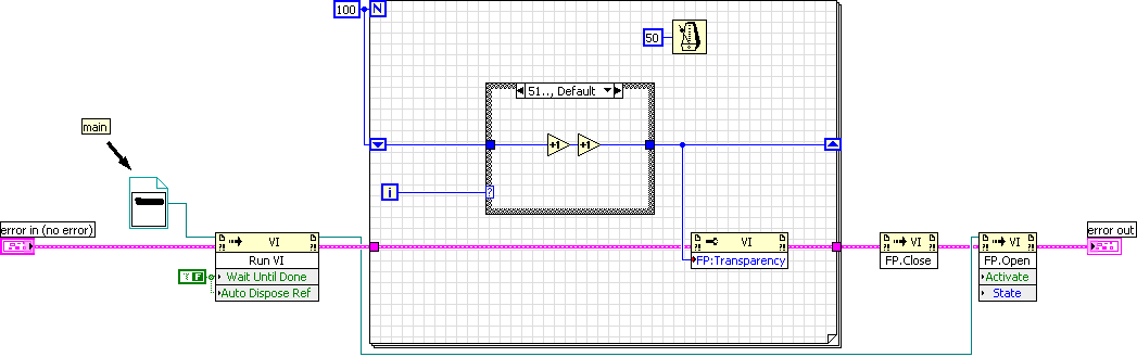 Ich nehme an das oben gezeigte VI wird vom Haupt-VI zu beginn geöffnet. Wie erstelle ich denn dann die richtige VI referenz (also das, was bei dir mit Pfeil und durchgestrichenem Text erscheint)? Bei mir bleibt das Splash Screen VI leider die ganze Zeit offen und wird nicht geschlossen. Ausserdem wird die Transparenz nicht kontinuierlich durchgefahren...