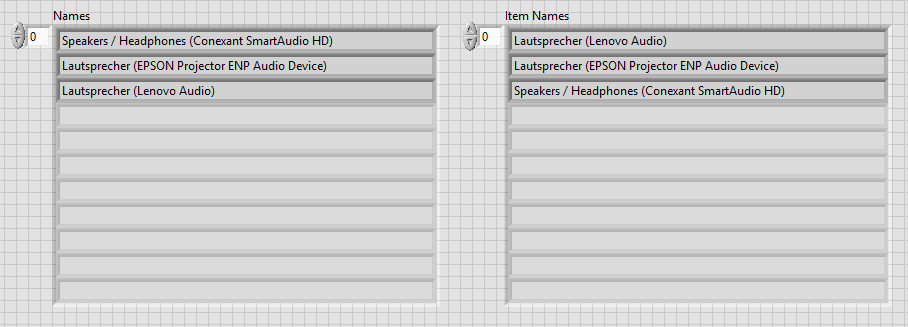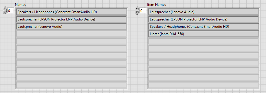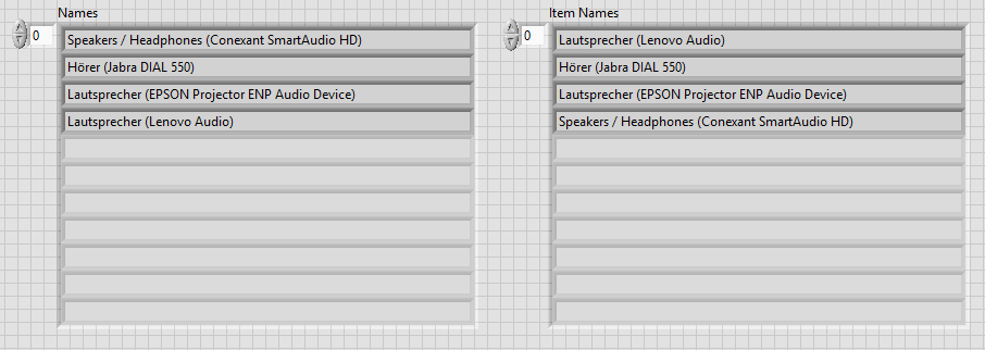 Das Problem ist aber, wie im Bild AudioDev-2 zu sehen, die Devices nicht richtig über Get Num Devices.vi und Sound Device Info.vi (Names) erkannt werden, wenn ein Audiogerät angeschlossen bzw. entfernt und LabVIEW schon läuft und nicht neu gestartet wird.