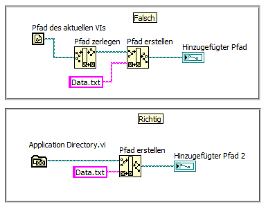 Hier richtiger und falscher Aufruf eines Pfades: (Dabei wird hier als Beispiel angenommen, dass sich die TXT-Datei im Verzeichnis der Exe bzw. des Main-VIs befindet)