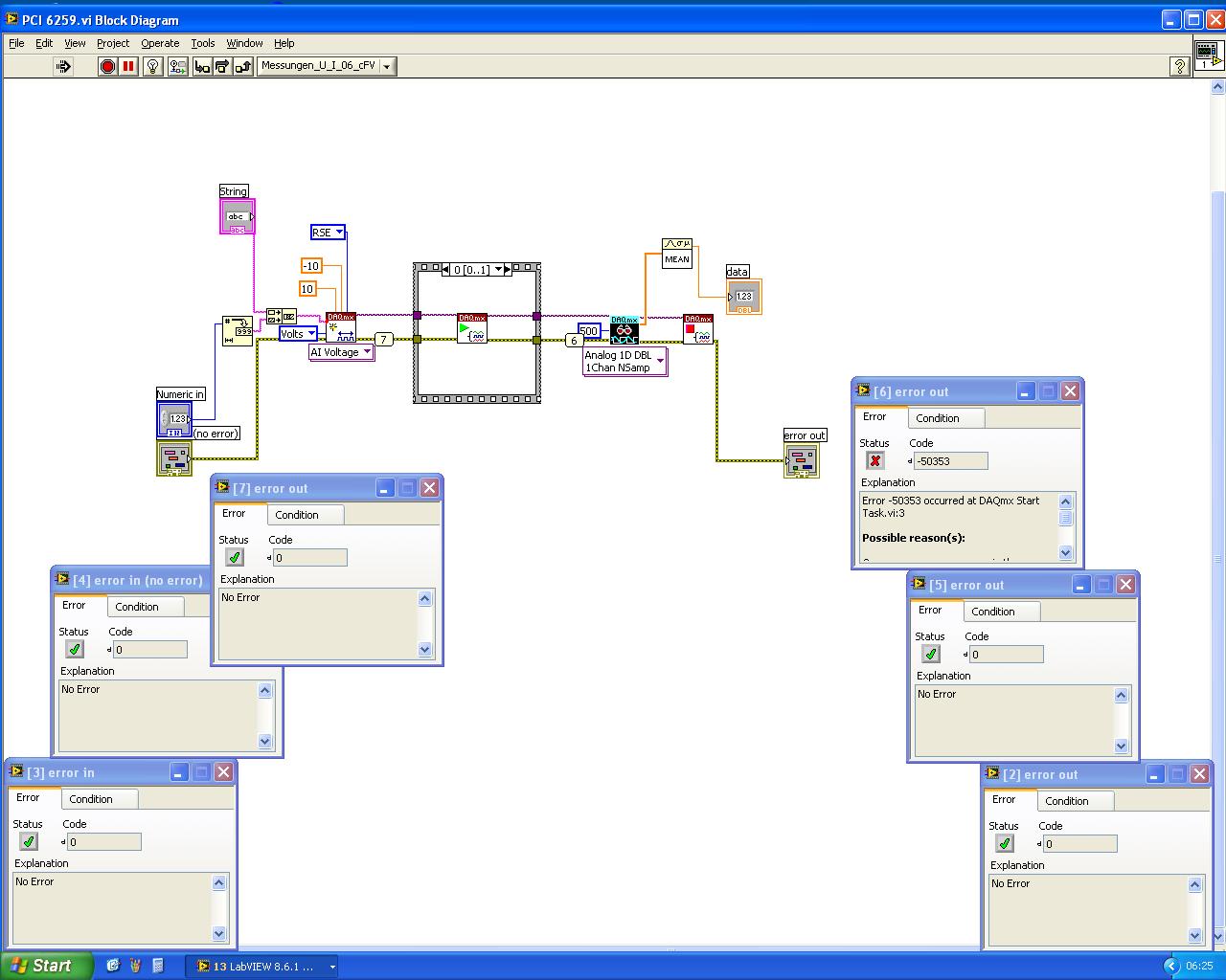 Es werden Analogen Kanäle abgefragt (siehe Bild) mit einer PCI6259 Karte und SCB-68 Box.