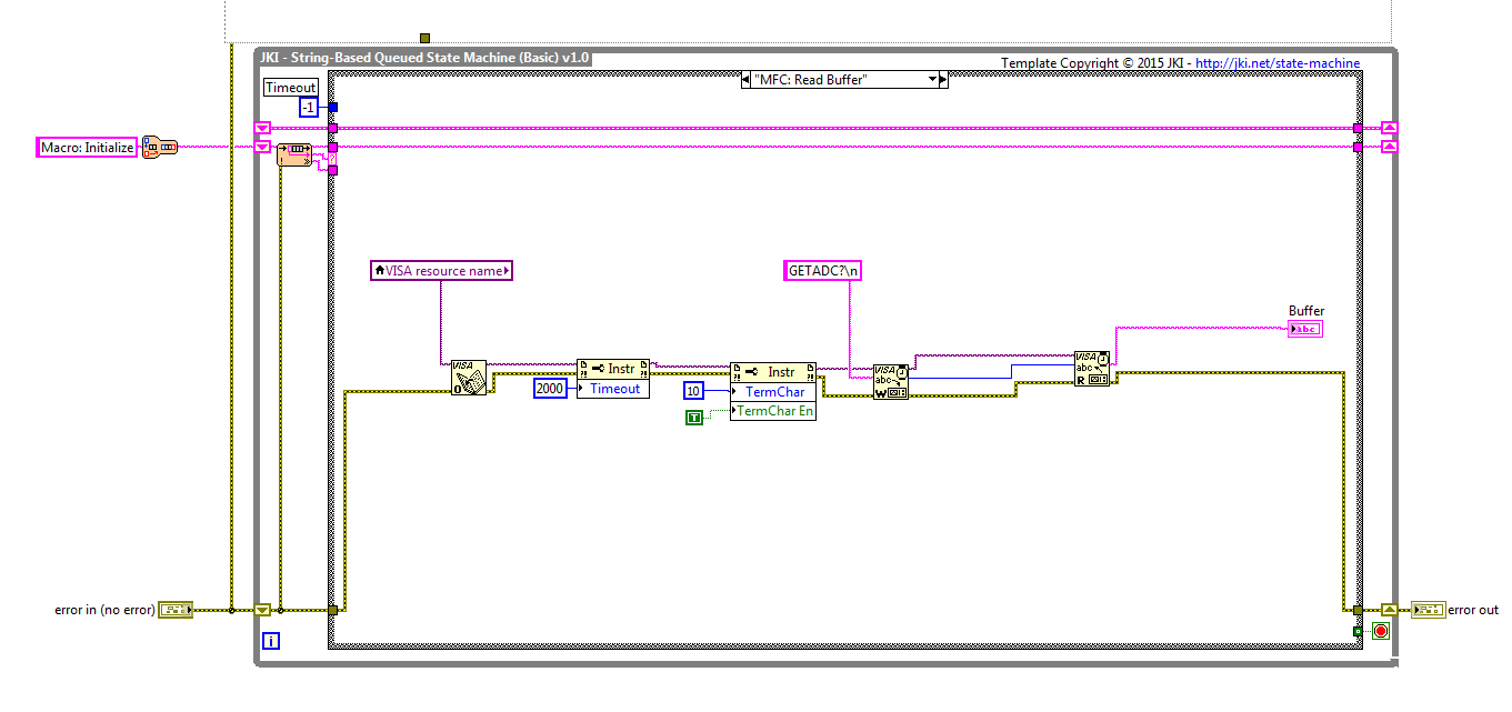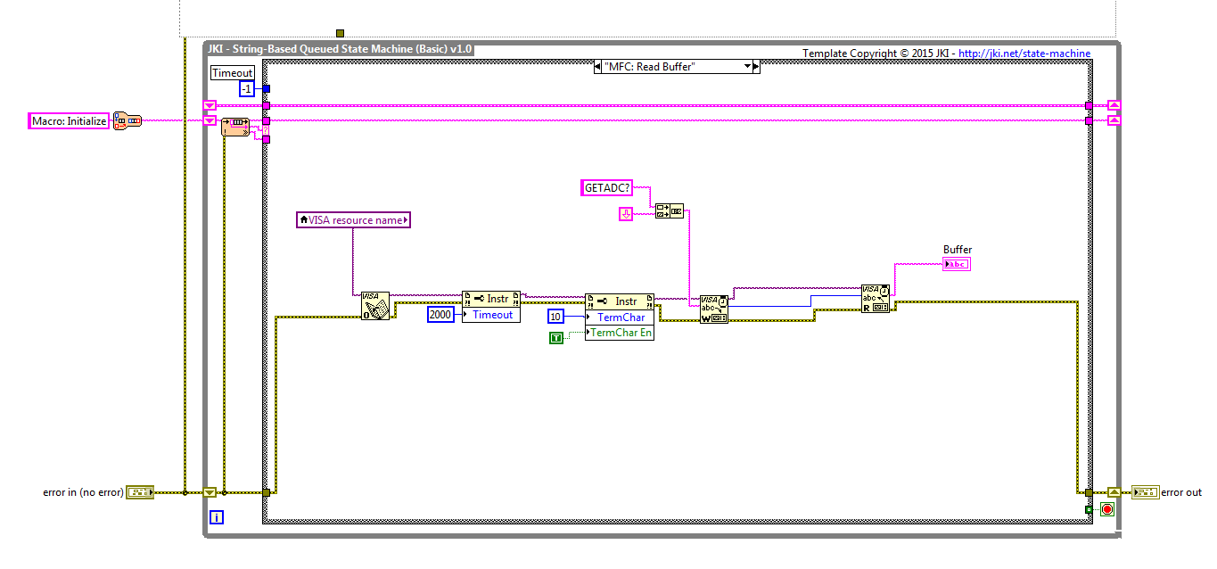 ich habe ein USB Test&Measurement Device bestehend aus ADCs und DACs zur Ausgabe von Steuersignalen und Aufnahme von Messignalen. Das Gerät kann mit Hilfe von NI VISA gesteuert werden. Ich kenne auch alle Kommandos, die das Gerät akzeptiert. Beispielsweise möchte ich mit Hilfe des Kommandos "GETDAC?" die aktuelle Spannung aller 8 Kanäle auslesen. Im angehängten Bild ist das mit VISA Interactive Control gezeigt. Das funktioniert. In meiner LabVIEW Applikation bekomme ich jedoch ein Fehler zurück: "VISA: (Hex 0xBFFF0015) Timeout expired before operation completed." Im zweiten angehängten Bild ist mein Beispiel gezeigt. Wo liegt das Problem? Selbst im Instrument Assistant kann ich mit diesem Befehl Daten von meinem Gerät bekommen. Mit dem InstrTimeout habe ich bereits herumgespielt.