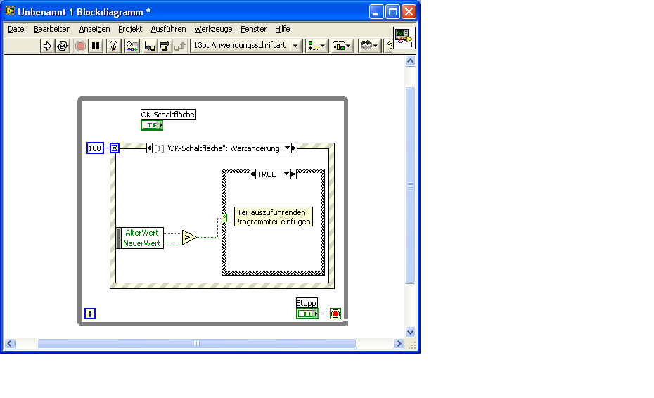 Fall 2: Der Kopf wird bei Beendigung das Programms mit lokalere Variablen rückgesetzt. Hier ist - zumindest solange das Programm noch in Entwicklung ist - eine Komplikation denkbar. Man drückt den Stop-Knopf, das Programm wird aber wegen interner Fehler nicht beendet. Man stoppt daraufhin das Programm mit roher Gewalt. Das Kopf wird dann nicht rückgesetzt, und der nächste Programmstart beginnt mit gedrücktem Knopf. Das nächste Bedienereignis beim Betätigen das Stop-Knopfes ist dann der true-false Übergang. Wenn man die beiden Fälle nicht unterschieden hat, dann stoppt das Programm auch dann. Aber was ist schlimm daran, wenn jedes Herumfummeln am Stop-Knopf den Abbruch bewirkt? Wozu sonst ist der Knopf denn da?
