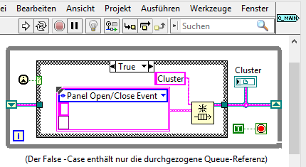 (09.02.2015 23:39 )teegee schrieb: - Die Queues werden in sub-VIs erzeugt. Das macht den Zugriff in sub-VIs einfach, da sie nicht als Parameter uebergeben werden muessen. Der Uebersicht halber wuerde ich alle Get-Queue VIs in ein disabled diagram auf das Main BD legen.