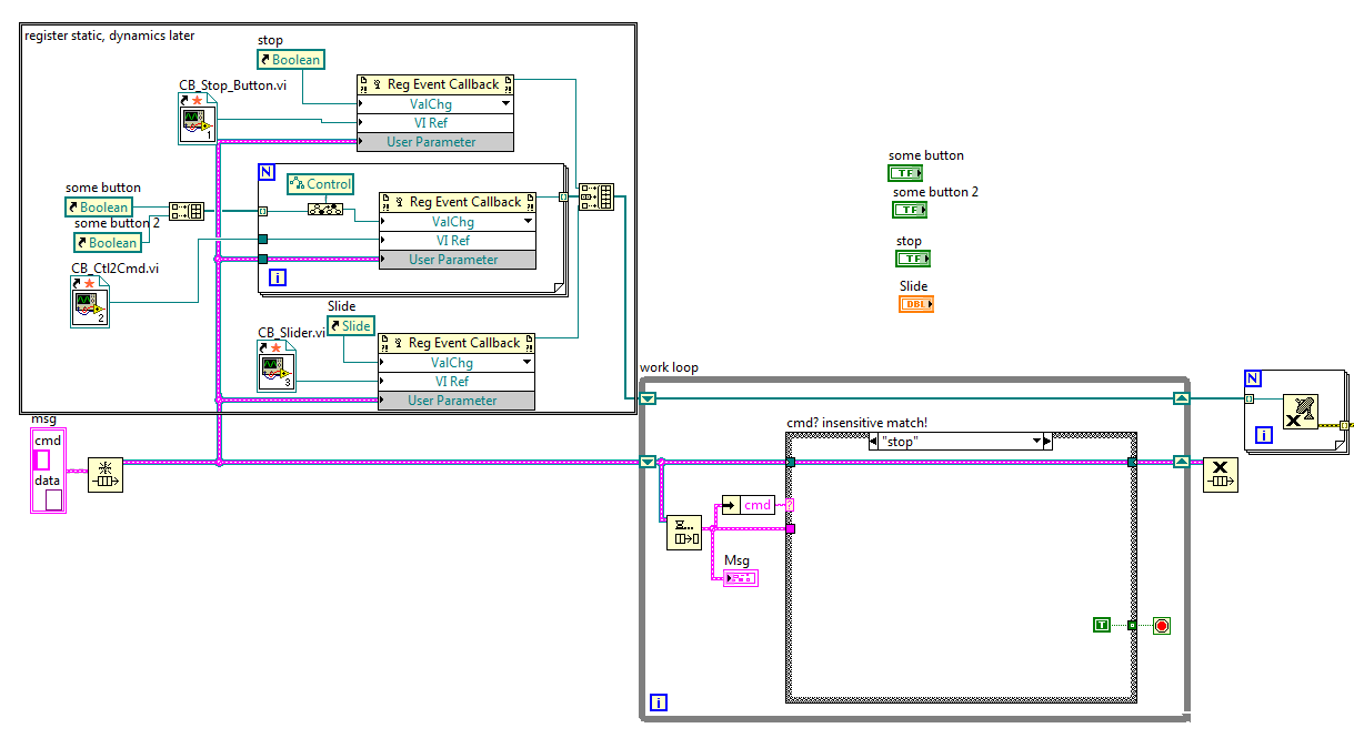 Genau wie Du in Deinem Beispiel gezeigt hast, werden die ActiveX-Ereignisdaten in dem Callback-VI als Variant empfangen, und mit Hilfe von Queues an das reentrant Gerätetreiber-Transaktions-VI weitergereicht, dass die Kommunikationsdetails implementiert.