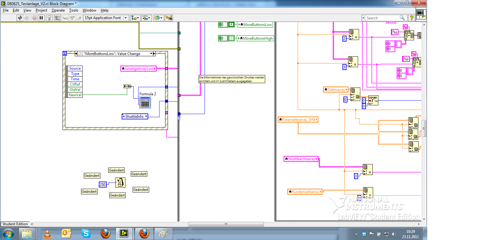 Ich steuere eine Testanlage über Labview und TwinCat und protokolliere und Verarbeite die Messergebnisse in LabView bzw. Excel. Die Kommunikation mit TwinCat funkt und habe auch gleich eine zweite Testanlage mit hineingenommen. Die Verarbeitung der Testanlagenergebnisse (Messwerte) erfolgt in zwei verschiedenen Schleifen. In einer dritten Schleife ist eine Eventstruktur erstellt worden die die Tasten abfragt und anschließend einen CASE ausführt. Hier werden dann sub.vi aufgerufen für die Ausgabe von Informationen bzw. Interaktion mit der Anlage. Kleines Bildchen unten.