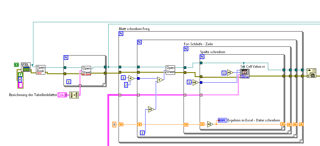 ich möchte gerne große Datenmengen von LabView nach Excel exportieren. Zu diesem Zweck habe ich auch ein Programm erstellt, welches unten angehängt ist. In diesem Programm kopiere ich die Daten in die Zwischenablage und kopiere im nächsten Schritt die Daten über einfügen in eine Exceldatei. Dieser Vorgang ist aufgrund der großen Datenmengen etwas langsam. Ich würde gerne die Daten über "Daten in Excel exportieren" in Excel einfügen. Also ich kann das natürlich auch. Allerdings würde ich gerne sowohl die Zieldatei als auch das Tabellenblatt wählen. Geht das? Vielleicht hat jemand von Euch eine Idee.