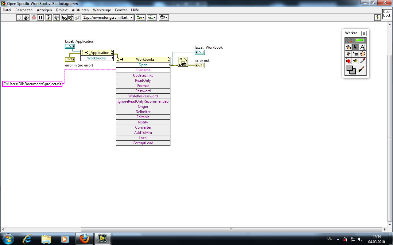 ' schrieb:Habe ihm im Blockdiagramm vom Baustein "Open Book" einen Namen vorgegeben und parallel dazu mit Excel eine Datei erstellt die ich so benannt habe.