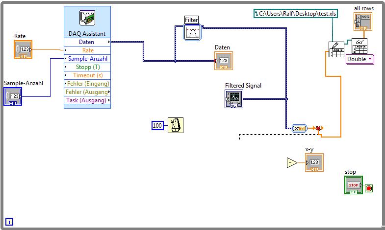 Um ein Signal nach einer Sekunde noch einmal zu messen, solltest du einen Delay von 1000ms statt 100ms verwenden (und vielleicht hier besser "Wait" anstatt "Wait for next multiple"). Wenn dein DAQmx richtig (!) konfiguriert/programmiert wird, brauchst du diesen zusätzlichen Delay nicht mehr, da dann die Wartezeit durch Samplerate und -anzahl bestimmt wird.