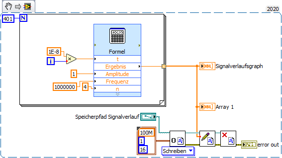 Ein oranger Draht steht für float-Werte. Die Dicke eines Drahtes zeigt Array-Dimensionen an. (LabVIEW-Grundlagen!)