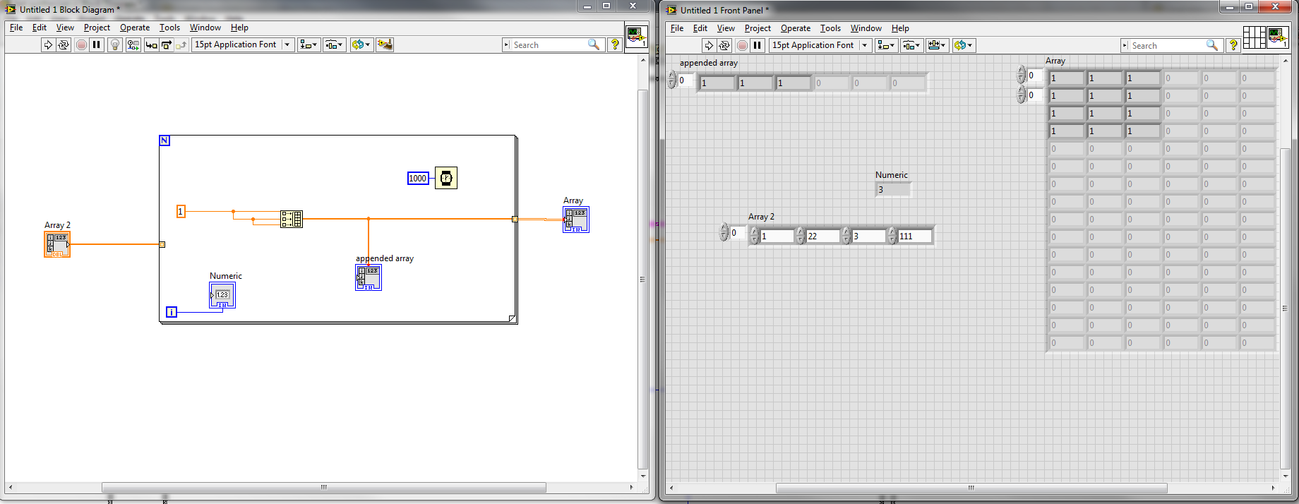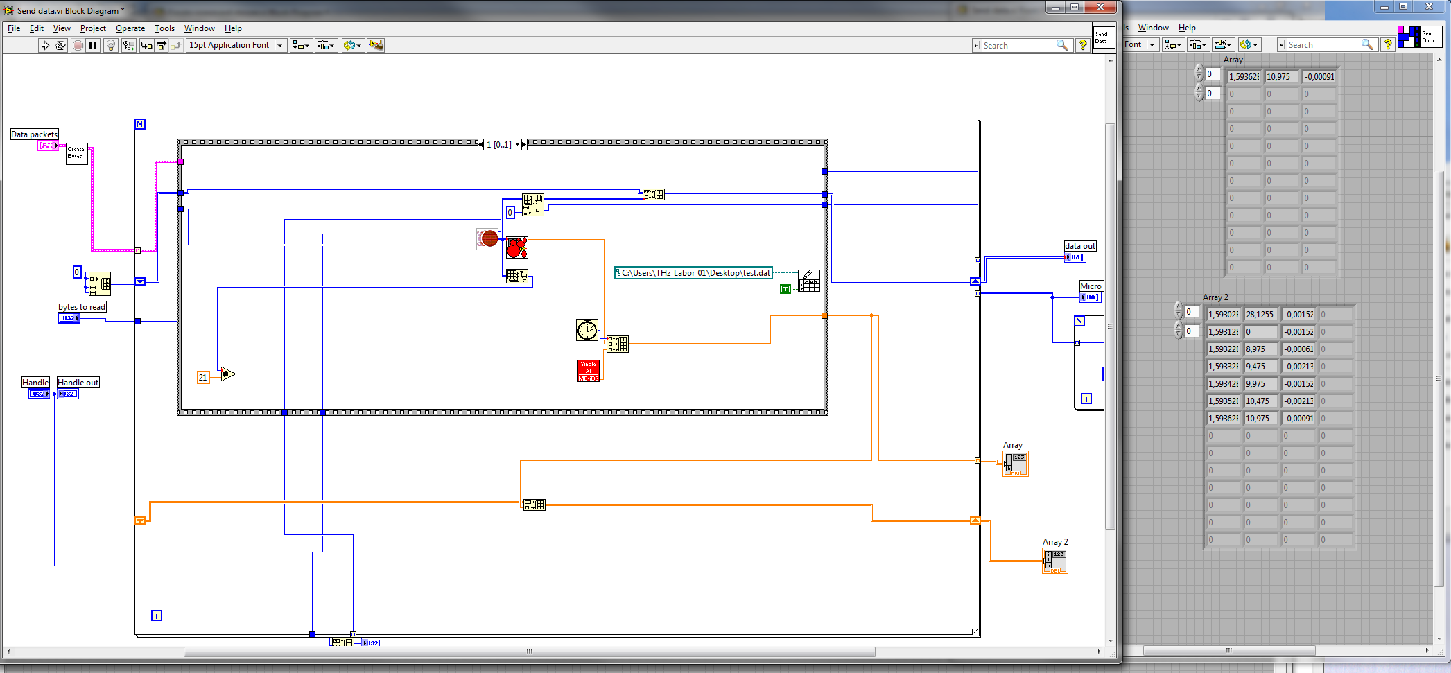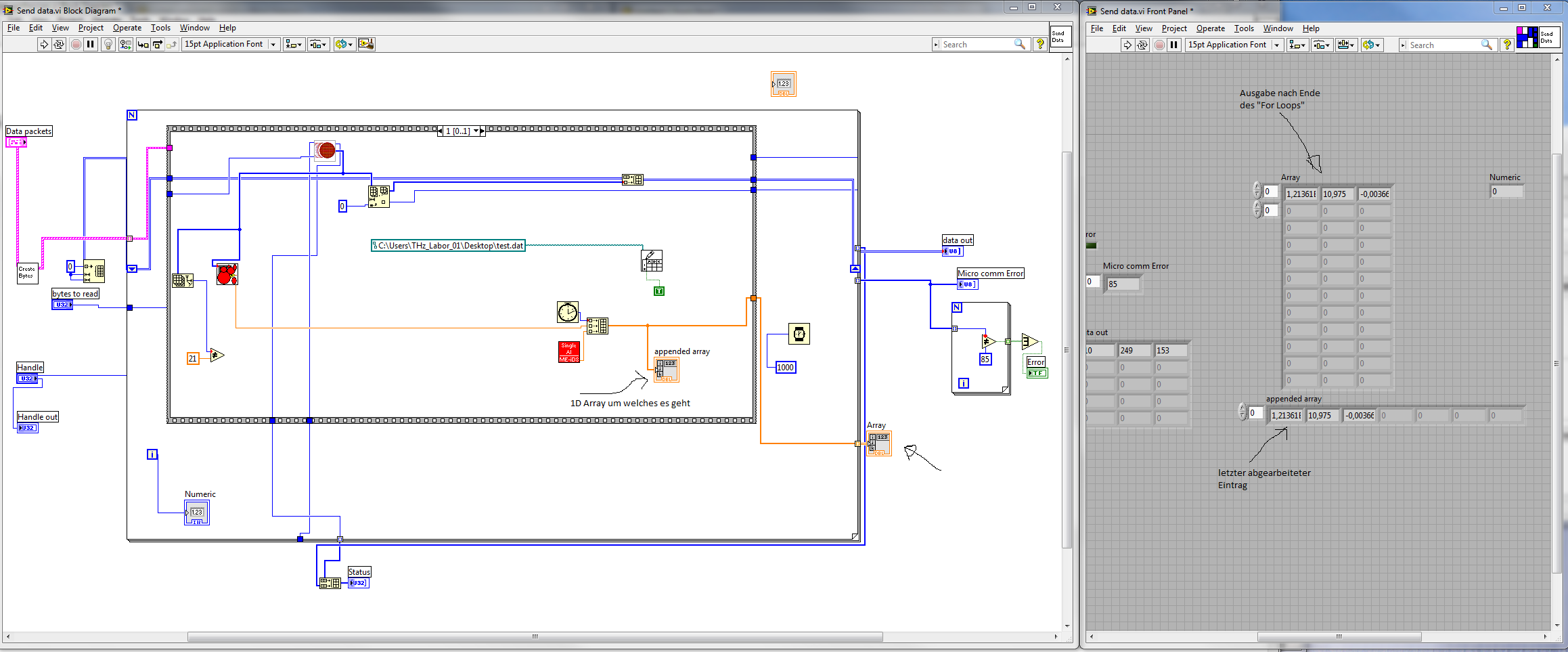 Hier jetzt meine Lösung als Bild. Ihr seht im front panel, die obere Zeile nach dem Durchlauf des Programms, indem der nächste Wert immer wieder auf die erste Stelle gegeben wird und dadrunter meine zusammen geschusterte Lösung, die aber ja auch funktioniert und alle 1D arrays zu einem 2D array zusammen fügt.